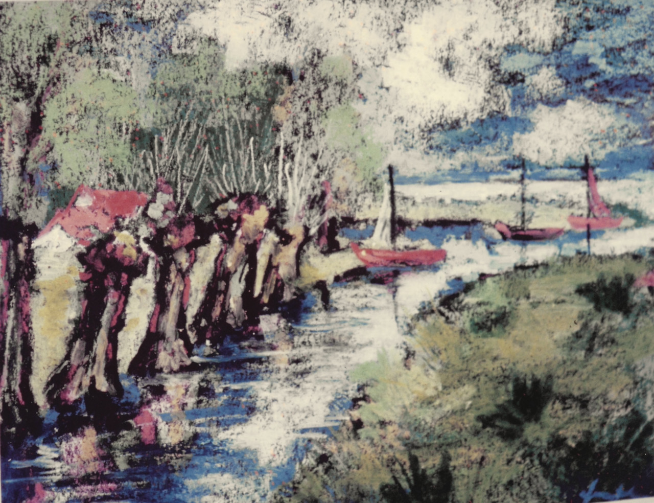 Da ist die Weser-Flußschleife mit heiteren, verwaschenen Pastell­farben. Die expressive Handschrift bricht lediglich in den zusam­mengestrichenen Konturen von Flußufer, Pappelsilhouette, Flußkäh­nen und Bergkamm durch. Der Betrachter fühlt sich erinnert an ein Aquarell, das Heckel in den dreißiger Jahren am Oberrhein malte.